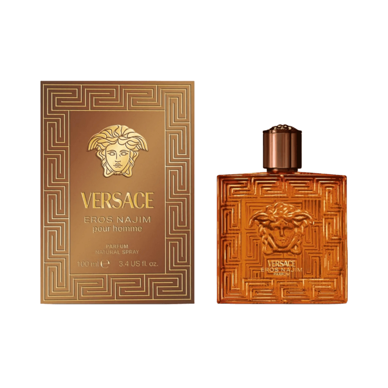 Versace Eros Najim is a Parfum concentration with an oriental-woody composition, offering rich spices, sweet caramel, oud, and warm amber notes for a powerful and long-lasting masculine scent.